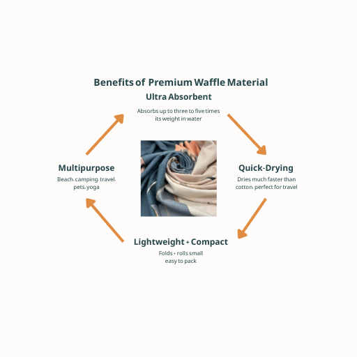 Premium microfiber waffle weave means sand slides right off, it absorbs 5X its weight in water, and it packs down smaller than you'd think (just 3.3 lbs with carry pouch included).