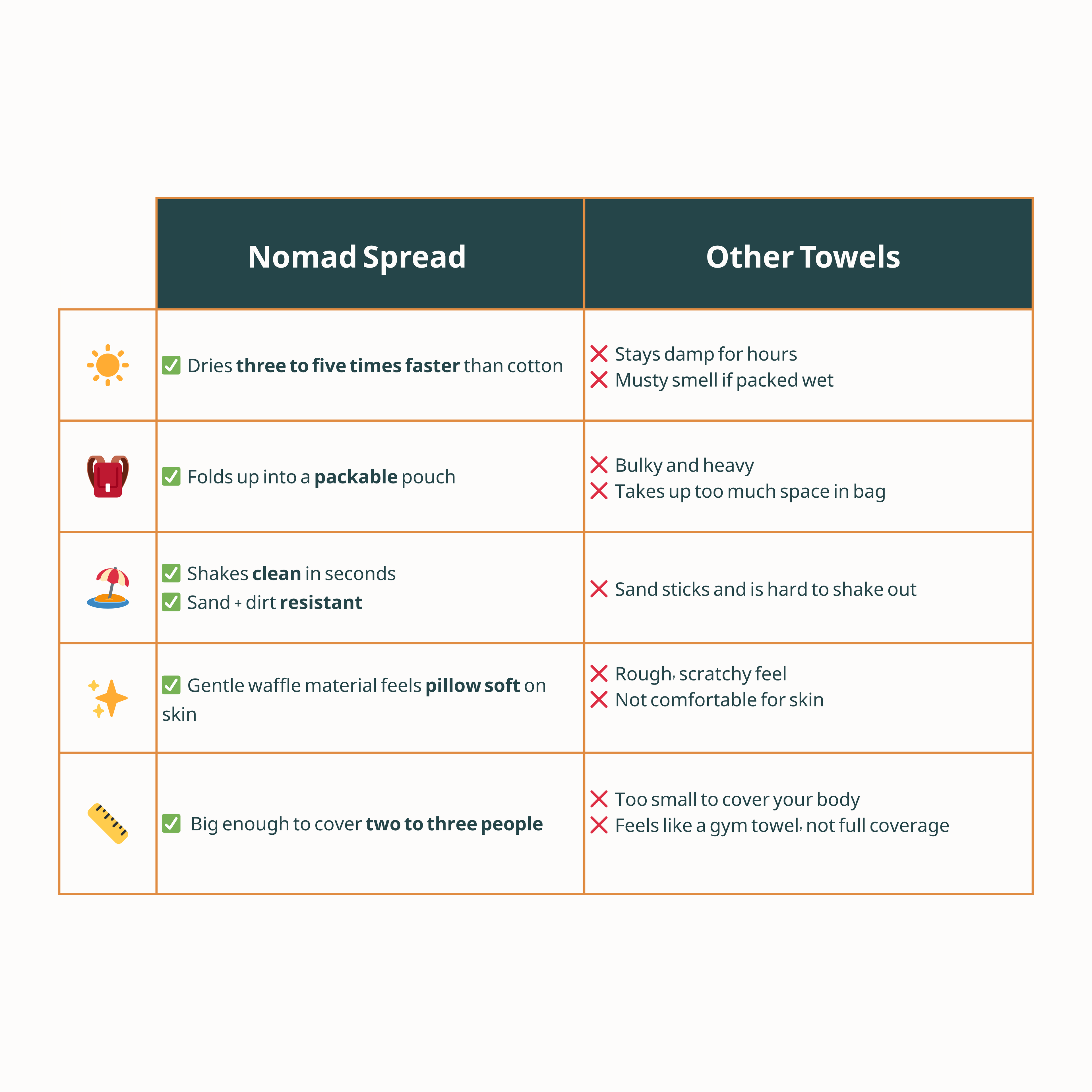 The Nomad Spread is 100 inches of quick-dry, adventure-ready comfort. Big enough for two people. Light enough to forget you're carrying it. And it dries in hours, not days.